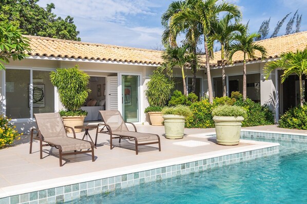 디럭스 하우스, 침실 3개, 전용 수영장 | 수영장 | 야외 수영장, 수영장 파라솔, 일광욕 의자