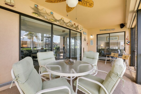 Covered Lanai & Waterfront View: Cape Coral Condo provides a marina and more.