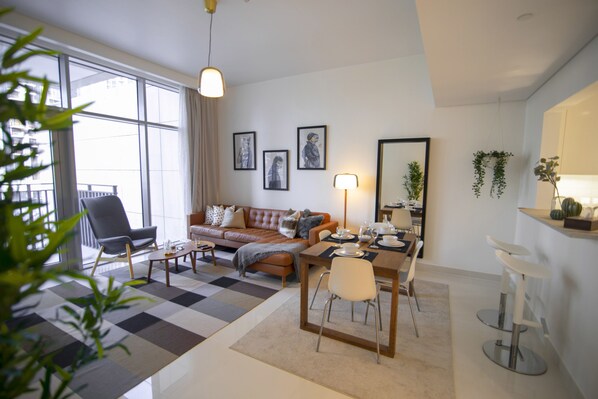 디럭스 아파트 | 거실 공간 | 위성 채널 시청이 가능한 55인치 LCD TV, TV