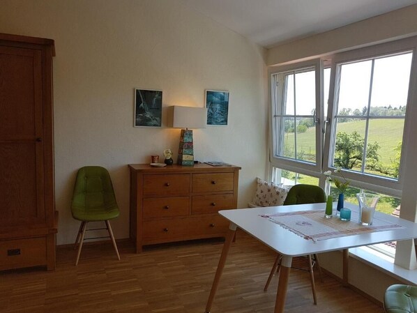 Landgut Apfelrose의 모든 객실에는 편안하고 여유로운 숙박을 위해 노트북 작업 공간, 별도의 좌석 공간 외에도 무료 WiFi, 별도의 식사 공간 같은 편의 시설 및 서비스도 마련되어 있습니다.