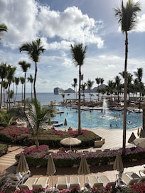 Guests lounge by multiple pools with convenient swim-up bars or unwind with massages while taking in the stunning ocean panorama at this resort