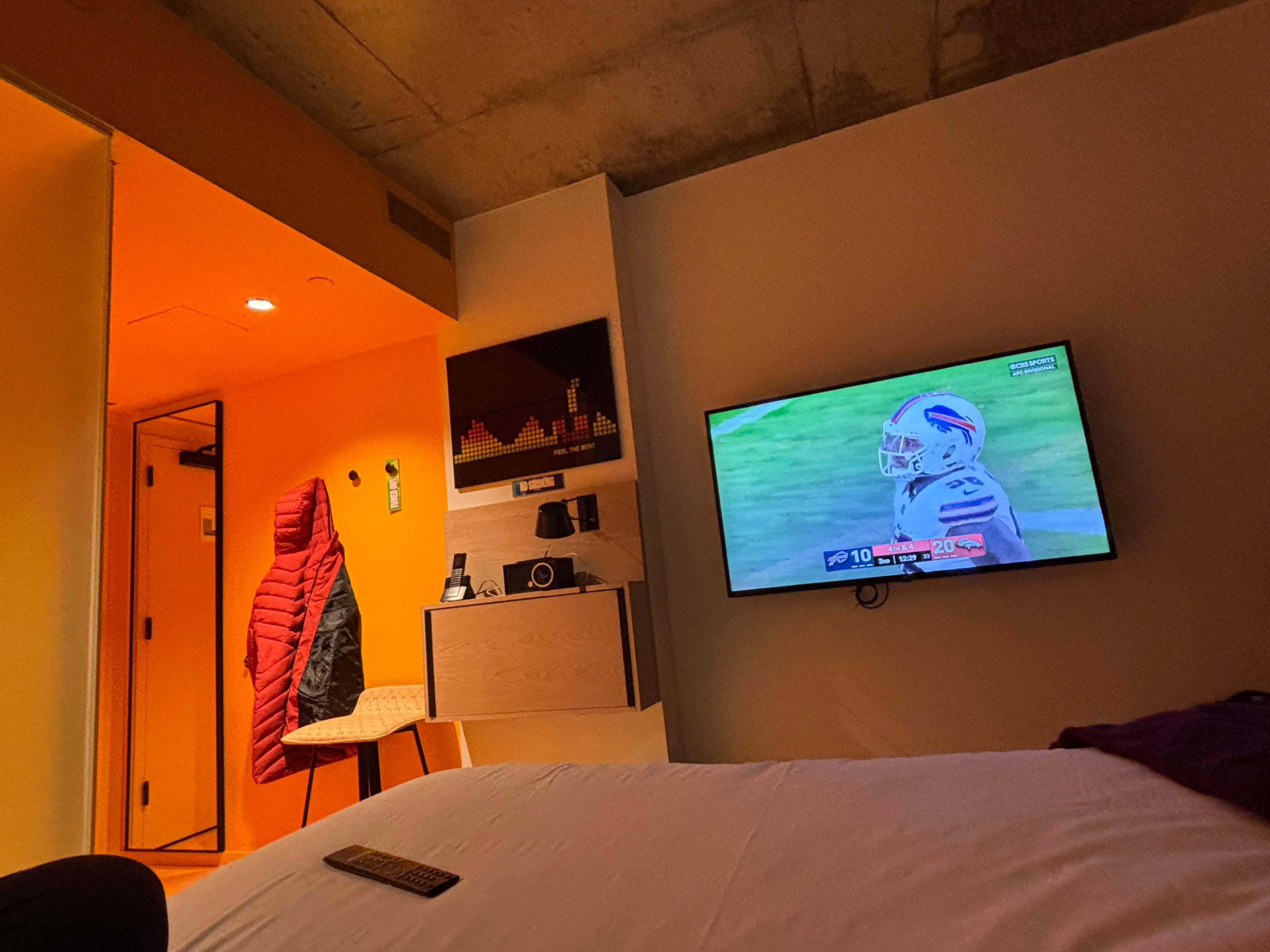 No hot water the entire 4 days I was there, water was luke warm at sink and shower. Shower door wasn’t sealed tight so water leaked out on floor. Pillows on bed where so soft to the point when you layed on them they went completely flat. Bedding had 4 sheets on it no blanket at all. And they charge a $20+tax amenity fee for WiFi, gym and 2 free drinks (sangria or premixed margaritas) even if you don’t use any you still get charged which I think is a rip off. The WiFi and gym should come with hotel for the price they charge for staying. I would have loved to have said something better about hotel cause I was really excited to stay looking at the photos but the overall experience made me decide to never stay again nor recommend this location to anyone. Take away automatic amenity fee if service not used, get better bedding and get hot water then you may actually then be a great hotel