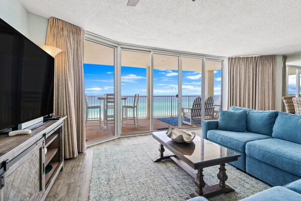 콘도, 침대(여러 개), 온수 욕조, 바다 전망 | 거실 공간 | 디지털 채널 시청이 가능한 40인치 TV