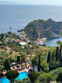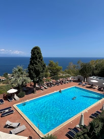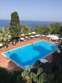 Travelers relax on sun loungers by the seasonal pool or explore the ancient streets of Taormina just steps from this Mediterranean retreat