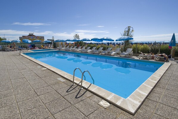 Tritone's seaside location offers ocean views, a complimentary breakfast buffet, a coffee shop, a children's playground, a restaurant with scenic vistas, and an outdoor pool area with sun loungers for relaxation.