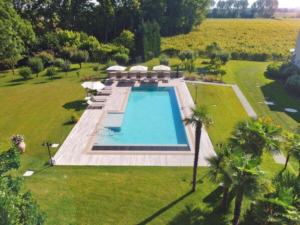 Travelers sip local wines on the rooftop terrace or beside the pool while exploring the natural beauty of the surrounding landscape