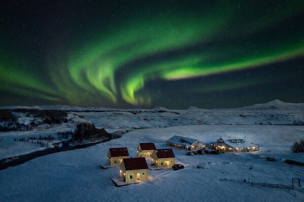 very sweet place. we were a family of 9 and stayed in 2 large cabins. breakfast was wonderful. dinner was also great. we saw the northern lights just as in the photos!