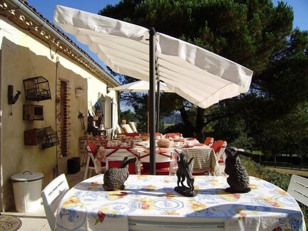 La Gabarie offers a perfect blend of rustic charm and modern comfort in the French countryside. Travelers start their day with continental breakfast on the sunny terrace before heading to the seasonal outdoor pool where loungers and umbrellas provide comfortable spots to unwind.
